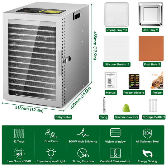Kwasyo 12 Trays Stainless Steel Food Dehydrator, Dual fan 360° Efficient Drying, 24H Adjustable Timer & 30-90℃ Temperature Control, Overheat Protection, Dehydrator Food Dyer uk for meat fruit, 800W