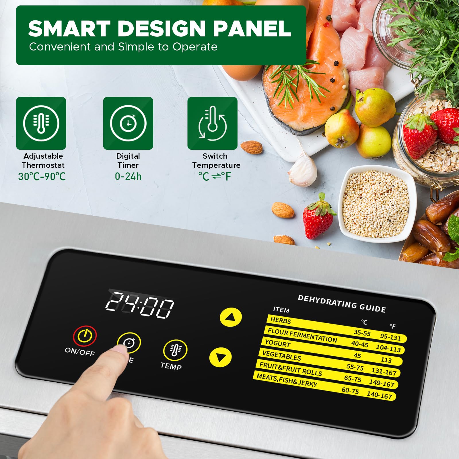 - 【Smart LED Touch Control & Adjustable Settings】The intelligent touch panel is easy to operate, ensuring precise control over temperature and time. Adjustable temperature settings from 30°C to 90°C and a timer for up to 24 hours allow you to customize your drying process for perfect results every time.